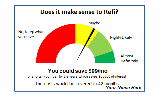 We offer a simple update on what your real options are.  Then if it doesn't make sense today, we update those on the first of the month, every month. Not some BS numbers based on an 'ideal client' who has perfect credit and everything else.  We leave those games to the junk mail people.  Instead, the numbers we send are based on your credit score, your current rate, your loan amount and the other details from your actual loan.